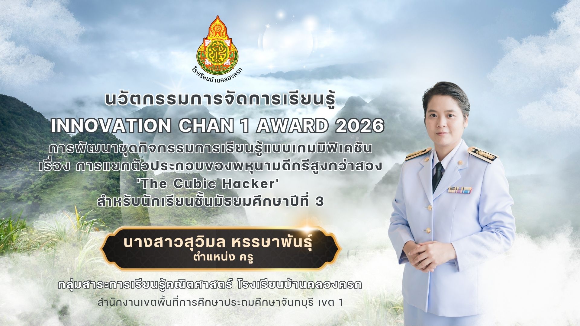 ชื่อผลงาน : การพัฒนาชุดกิจกรรมการเรียนรู้แบบเกมมิฟิเคชัน (Gamification) เรื่อง การแยกตัวประกอบของพหุนามดีกรีสูงกว่าสอง 'The Cubic Hacker' สำหรับนักเรียนชั้นมัธยมศึกษาปีที่ 3
